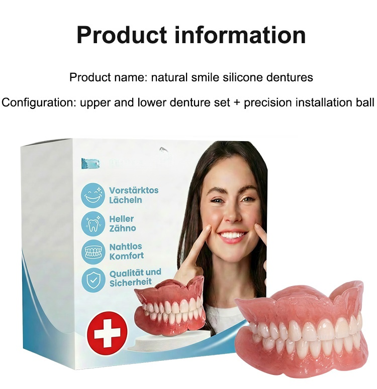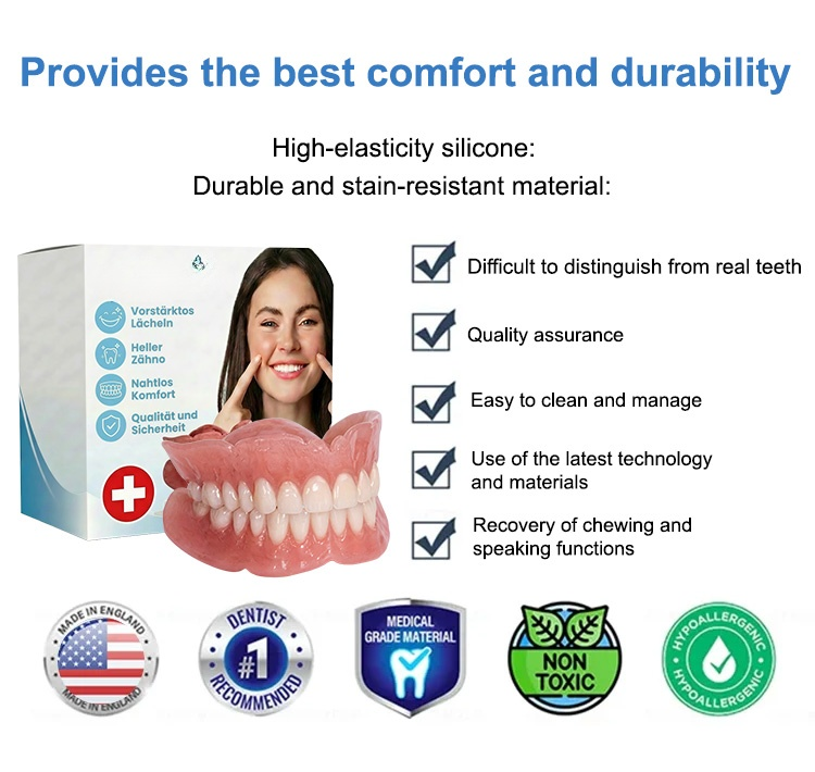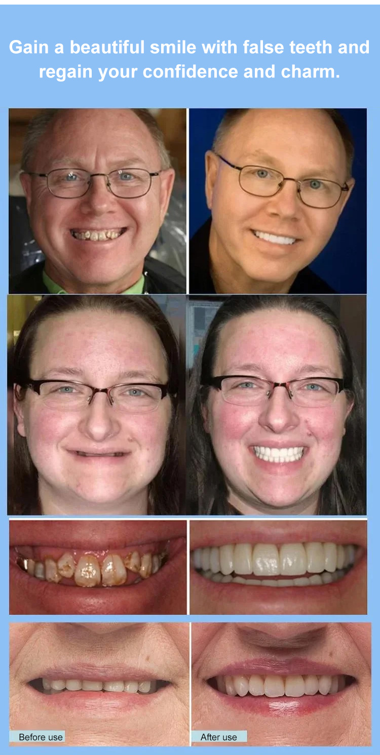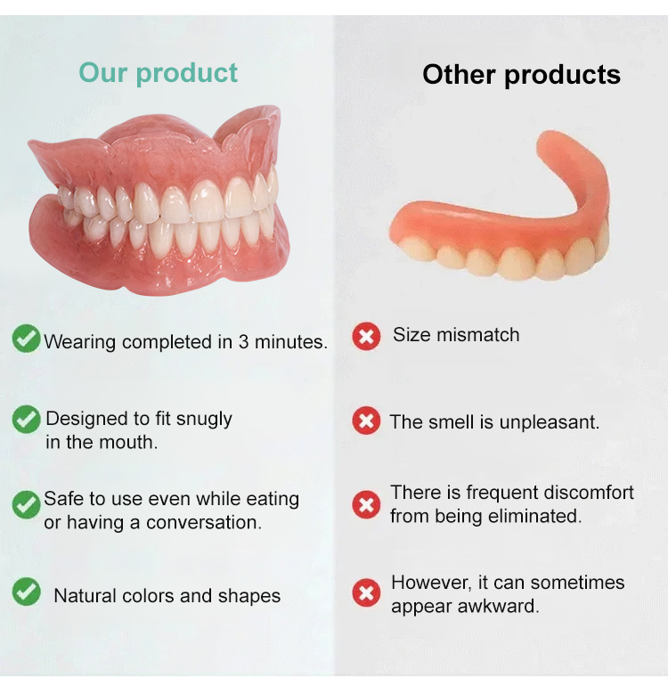 ✅1 second to easily wear, perfectly fit teeth, eat if you want to eat. ✅Soft silicone fits any denture, offering wear as comfortable as real teeth.